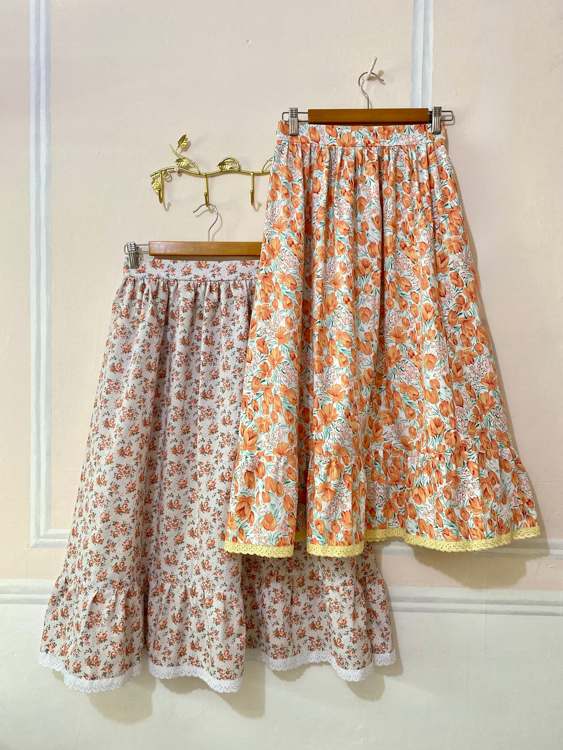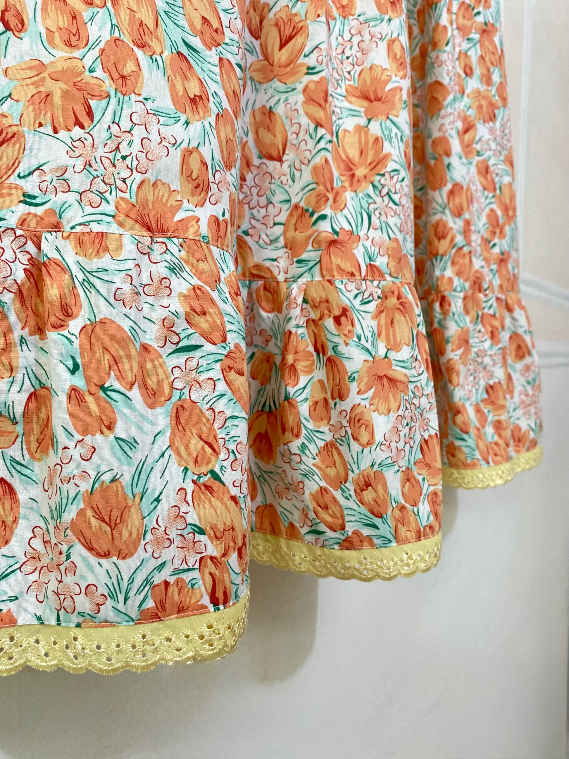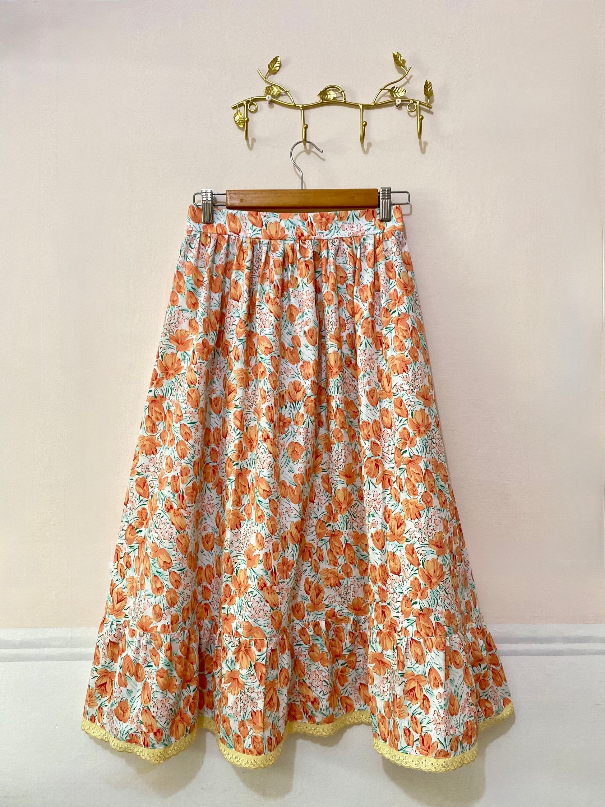 Falda de fresca tela de algodón con estampado floral, color blanco con anaranjado, verde y amarillo. Decorada con un delicado encaje de tira bordada. El cierre se encuentra por un costado.