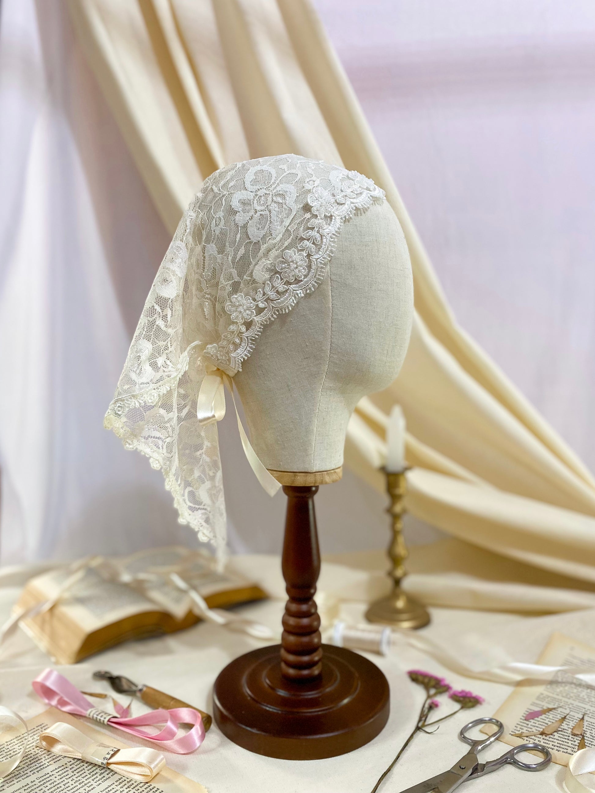 Pañoleta de encaje, finamente bordada con pedrería.
