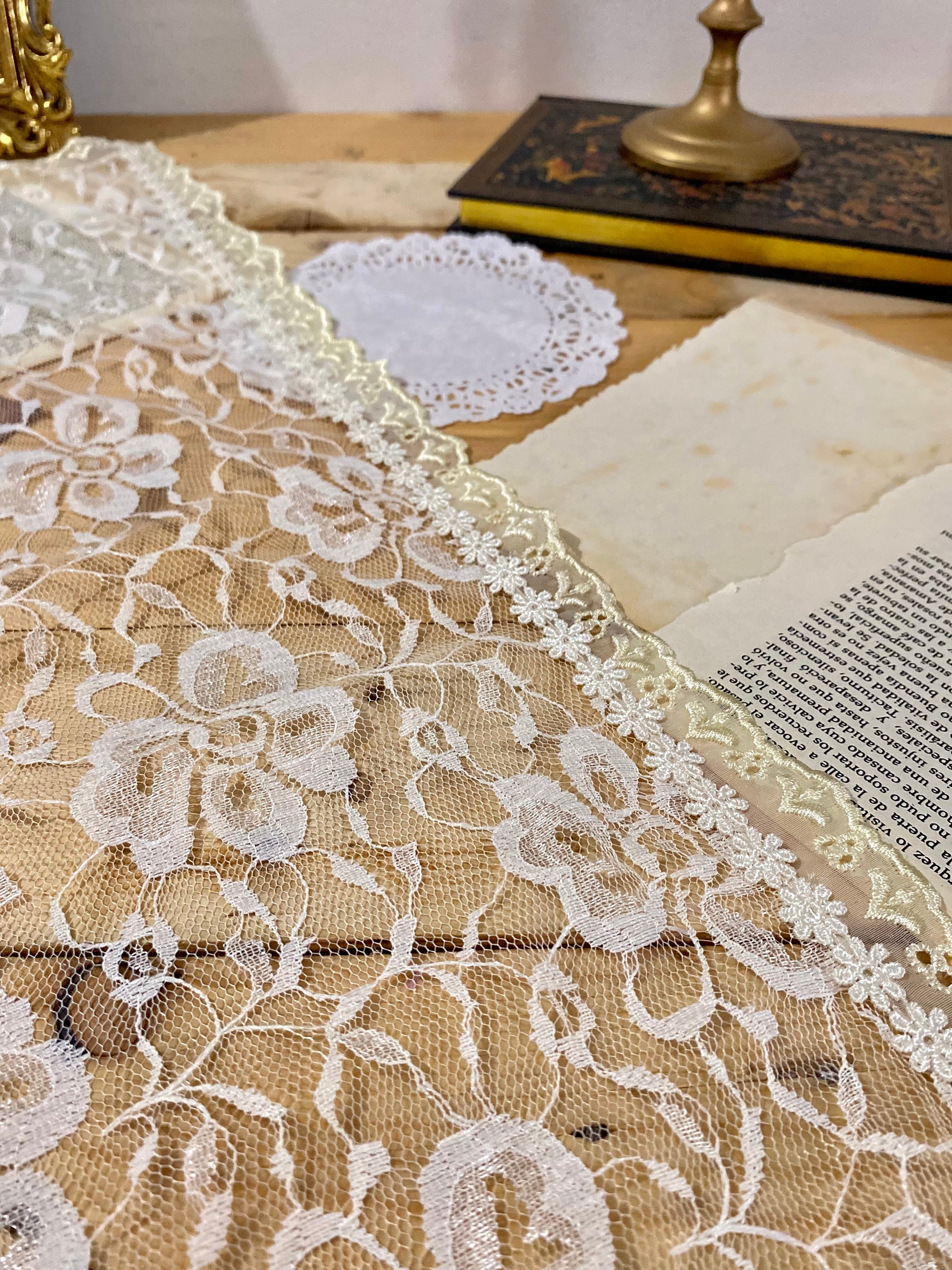 Decorado con un delicado encaje en tira de organza bordada y encaje guipur.